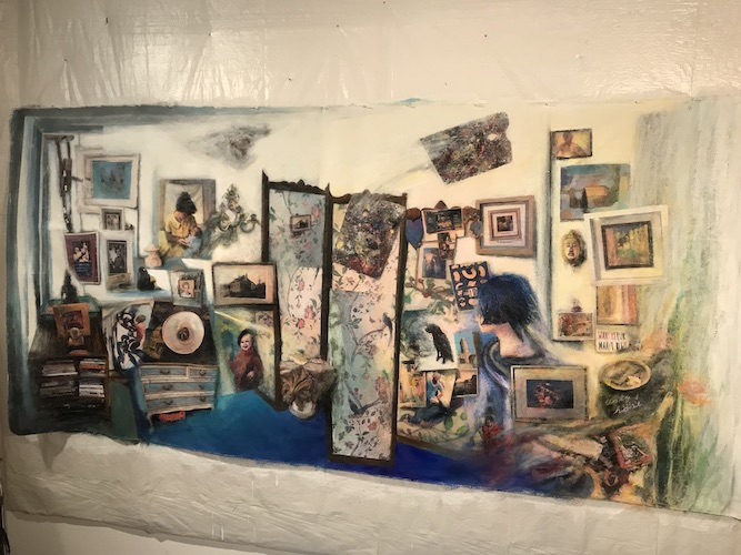 "Schilderhuisje - beeldverhaal" (2022) - 140 x 320 cm - gemengde techniek op doek
