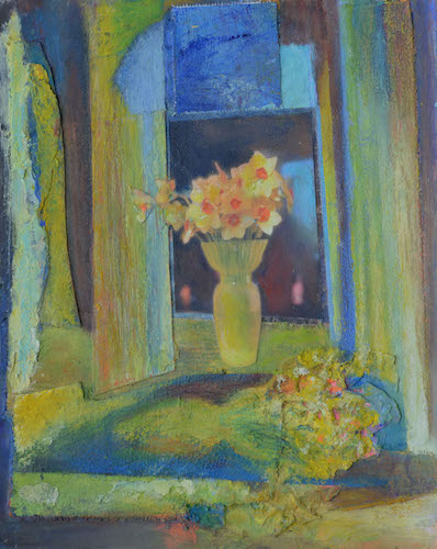 "Interieur met narcissen" (2022) - 28,5 x 23 cm - gemengde techniek op papier